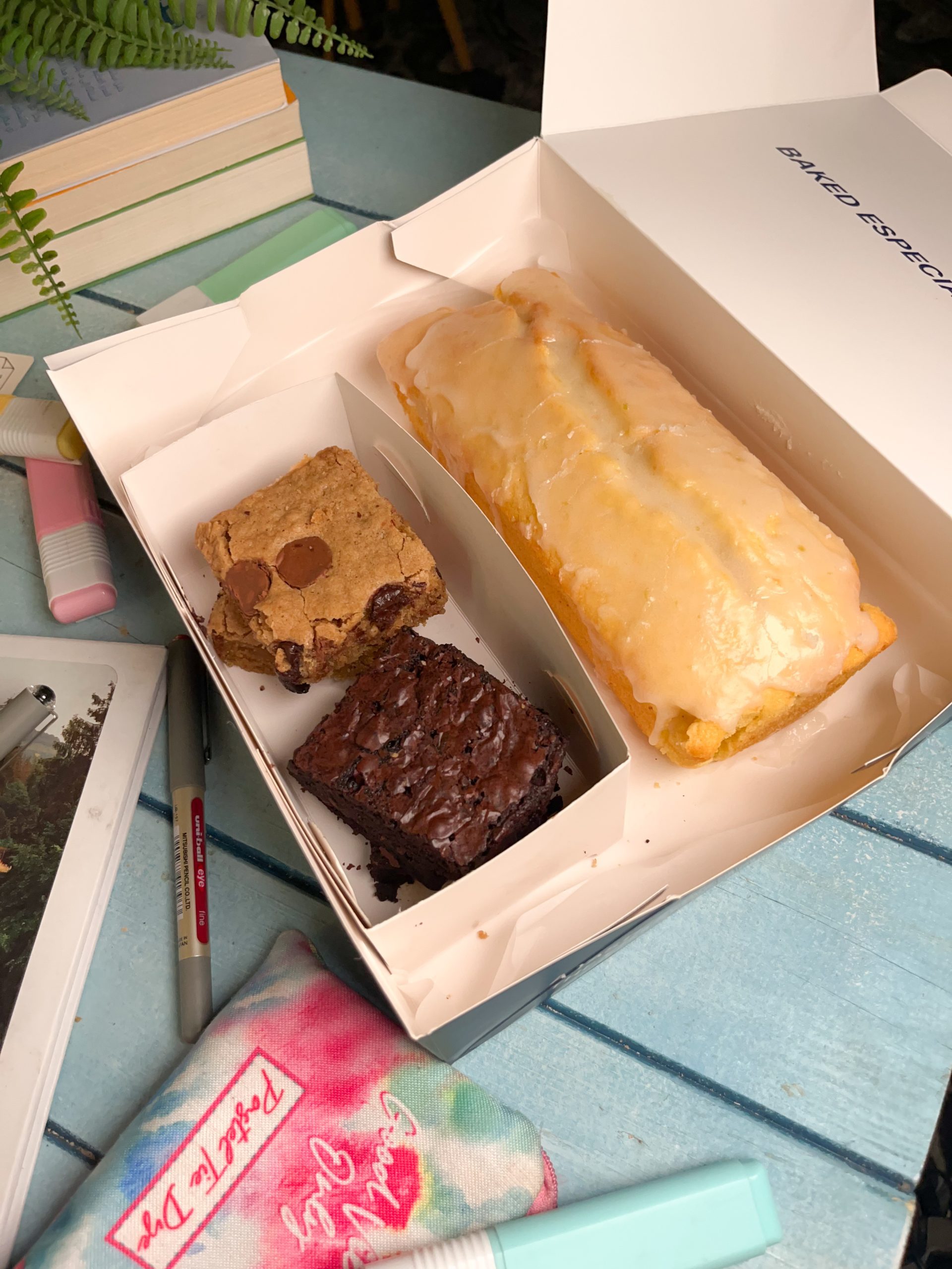 The Back to School Snack & Share Box includes a medium Pound Cake (Lemon or Pecan), 3 chocolate brownies, and 2 blondies with dark & milk chocolate — the perfect snack for cozy family evenings.